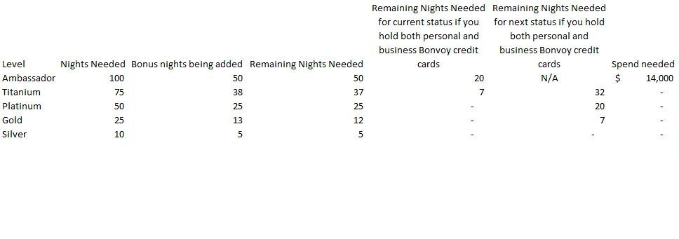 – Where it gets interesting is adding the double night promotion to having both a personal and business Marriott credit card. If you had Titanium status in 2020 and use 1 paid night coupled with 3 award nights in 1 stay, you will earn 8 nights, which will give you Titanium again through Jan 2023.
